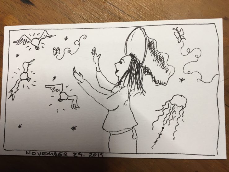 [2] for some reason, when I picture what an idea might look like, I think they must be light and nebulous, with glass-like transparency, not unlike the way jellyfish float through the oceans, ephemeral, solid and not solid at the same time. Visible and not visible…and then only for someone who might be looking in the right way, at the right time, slant-wise, out of the corner their eye, to receive them. They are gifts, aren’t they?