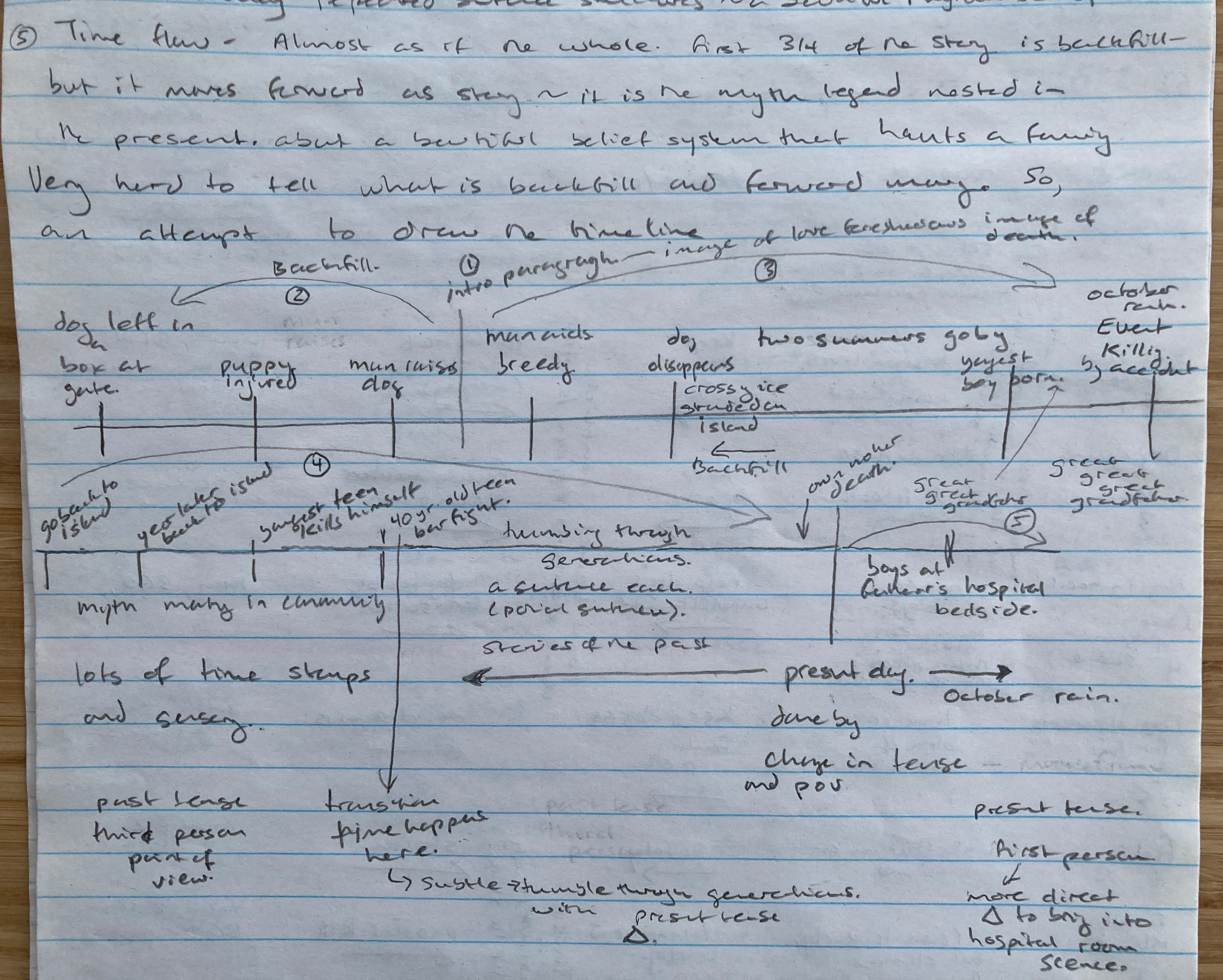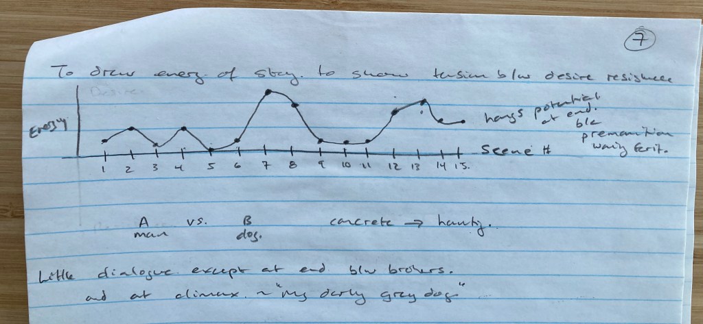 DG also uses diagrams and graphs…something I do in my day job all the time but had never thought to apply to analyzing stories. George Saunders also does this for story analysis. I love drawing diagrams and suddenly I’m able to understand composition from a different perspective. Here’s a few of my recent messy assessment diagrams: