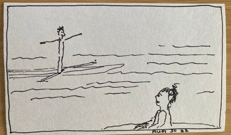 I was going to write how the coaches, young people, motor up beside me, nod at my technique, say, just keep doing what you’re doing. I was going to write that there’s a metaphor about writing somewhere in here, but I won’t. And yeah, so what if I tip? But the bay where we practice is shallow and the weeds sub-surface are thick and million fingered and the water snakes nose along among the geese and ducks and, sometimes, a bevy of swans.