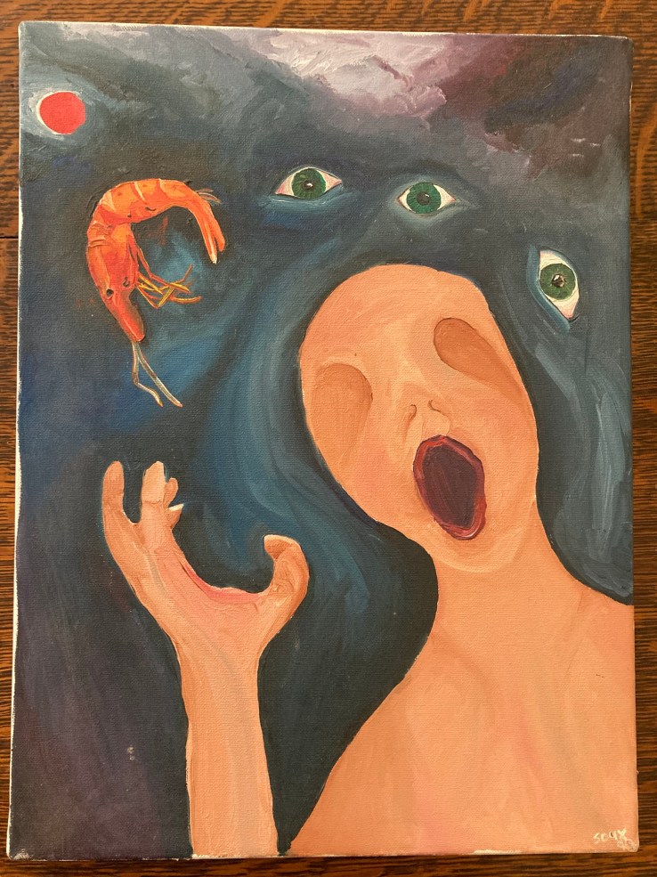 I went through a phase in my late teens and early twenties painting figures with no eyes – the two pieces here date from that era. Most of the artworks I produce are given away as gifts[1]. I can’t imagine many recipients of these screaming figures with their eyeballs floating in space might still grace their walls with my works. These two pieces might be the only ones left. They hang on the walls beside my writing desk.