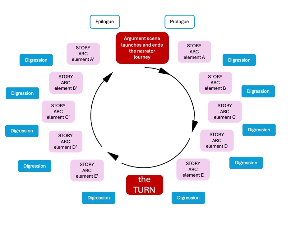 - Scenes from a variety of time periods associated with the protagonist/narrator (yes, I think these are the same character at this point, a persona of yours truly [insert graceful sweeping bow]). The “digression” elements of the overall structure (will touch on this below) are stories during the narrator’s childhood and during the narrator’s prehistory (before the protagonist is born) and some scenes are forward in time from the main story arc. I know, this is confusing to read in the abstract …in my mind it works though. What I continue to try to figure out is what I will use as the “signals” for the reader to keep track of where and when they are in the story. I don’t want this to be a disorienting mess…the path must be clear and effortless for a reader to follow[2].
